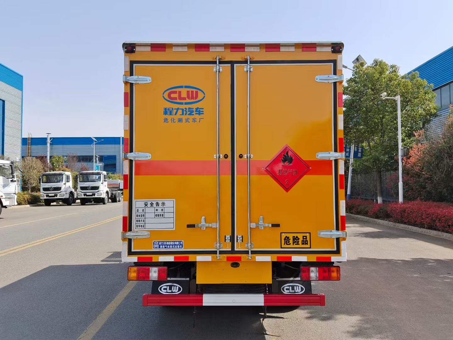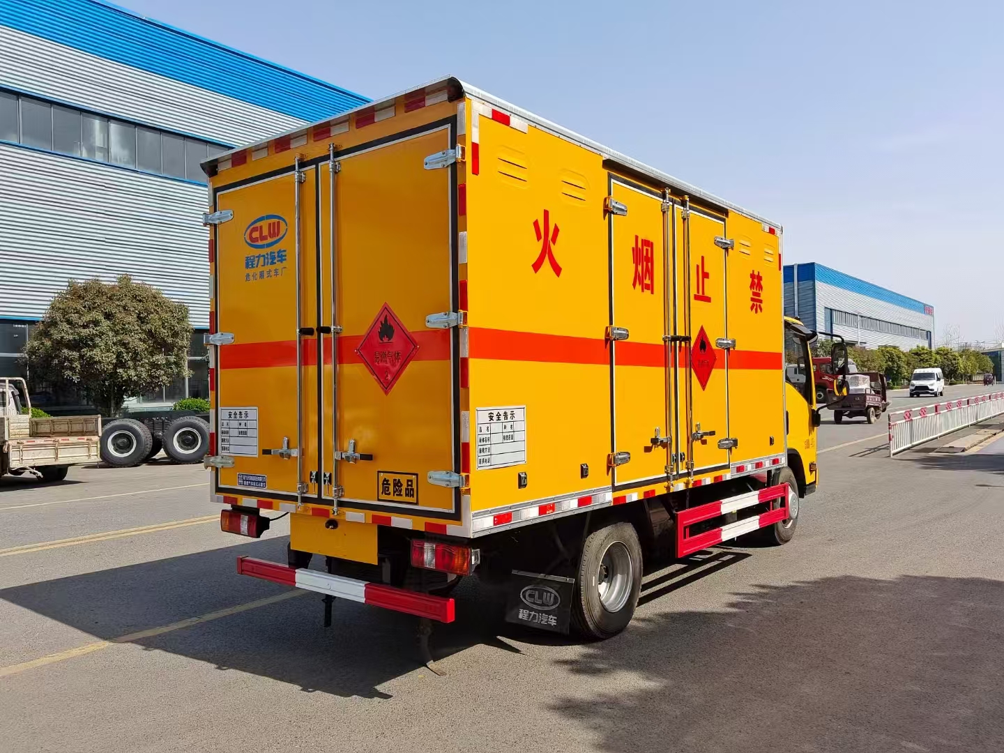 | 貨箱配置 | 廂體為雙層金屬骨架結(jié)構(gòu),外板采用冷軋鋼板,中間填充阻燃泡沫,內(nèi)飾為鋁板。底板為平板上鋪防靜電膠皮。廂內(nèi)兩側(cè)加裝固定貨物臥環(huán),門框帶防盜報警器,頂部帶煙霧報警器,廂體右側(cè)選裝側(cè)門,隨車配2個滅火器,危險標志牌,防火帽,危險品三角頂燈。 (選裝瓦楞板貨箱) (尾部可選裝液壓升降尾板) | ||
