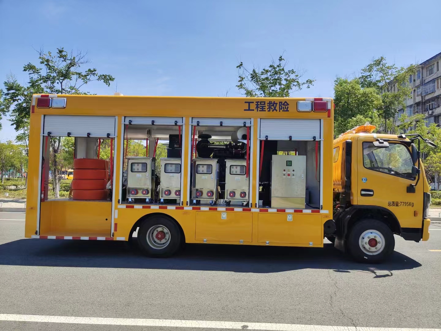 | 上裝配置 | 1、廂體外形尺寸根據(jù)實際公告標(biāo)準(zhǔn)。 廂體:具備運(yùn)輸、防雨、防火、阻燃、防塵、防銹、降燥,隔震、長期抗震結(jié)構(gòu)。外部鋼材為優(yōu)質(zhì)冷軋鋼板,表面處理平整,內(nèi)襯優(yōu)質(zhì)冷軋鋼板折彎骨架,強(qiáng)度牢固,配重合理。 2、廂體一體化鋼體結(jié)構(gòu)設(shè)計, 頂部平坦。廂體采用骨架式夾層形式,外蒙皮采用厚1.5mm優(yōu)質(zhì)防銹處理的汽車專用冷軋鋼板,中間骨架采用防銹處理后的鋼管焊接,頂層、側(cè)圍內(nèi)、外層之間填充長時間使用對人體無害的防火阻燃環(huán)保吸音棉,外層鋪蓋一層阻燃金屬布,內(nèi)飾采用0.8mm厚網(wǎng)孔板。底板采用鋼結(jié)構(gòu)底框架,上表面鋪厚2mm花紋鋼板。 3、車輛廂體采用整體包覆式,廂體兩側(cè)下部設(shè)置裙邊式,全封閉式結(jié)構(gòu),頂部為圓弧型,尾部有轉(zhuǎn)向燈、剎車燈、尾燈、霧燈,箱體表面光滑平整。車廂靠駕駛室前部為休息室,休息室內(nèi)帶折疊坐椅及折疊桌,往后為機(jī)組室,機(jī)組室左、右側(cè)布置進(jìn)排風(fēng)百窗,設(shè)置機(jī)組檢修門一個,下置登車踏步梯,車廂后端為后為卷簾門。右側(cè)排風(fēng)百葉窗下部為維修觀察艙門。左側(cè)下圍設(shè)置有工具箱及功能艙門等。右側(cè)下圍設(shè)置有汽車油箱艙、液壓控制艙等。 4、車廂尾部配置標(biāo)準(zhǔn)儲物貨架讓出水帶、加長電纜等附件存放有序、互不干涉,讓緊急排水搶險變得更加快捷、有效。 5、廂體噴漆:工程黃,與車頭同一顏色; 6、最終的門數(shù),形式,打開方式嚴(yán)格按照合同要求依據(jù)程力公告生產(chǎn); | ||